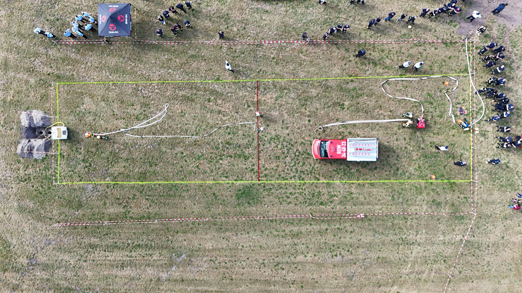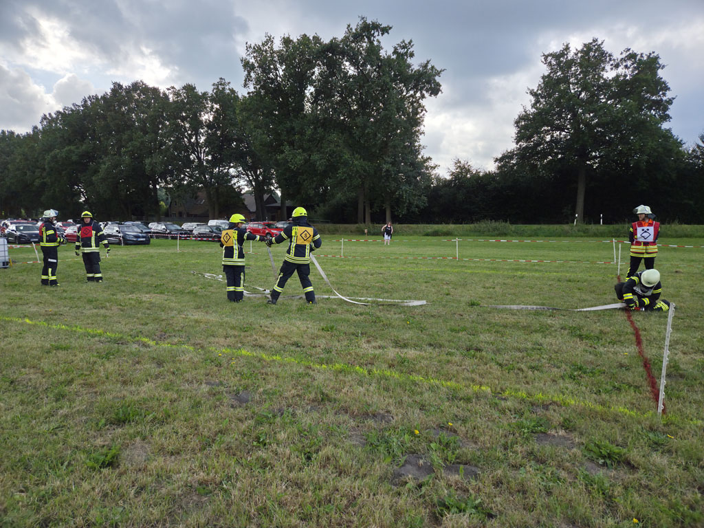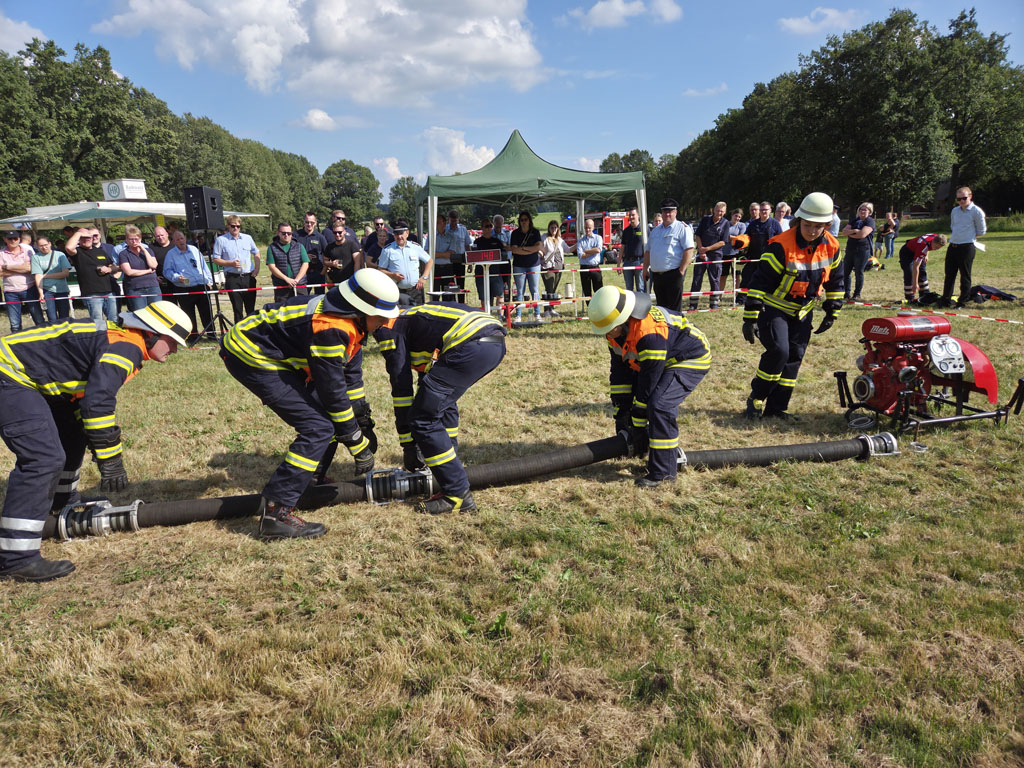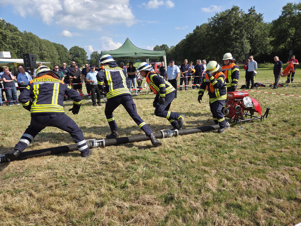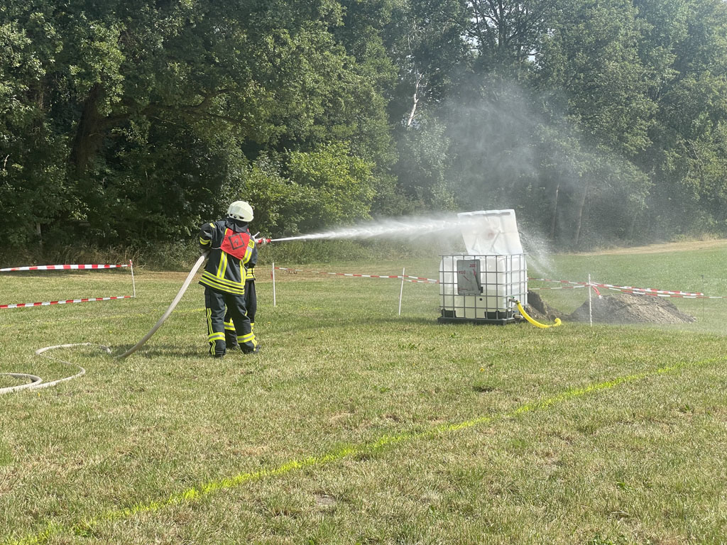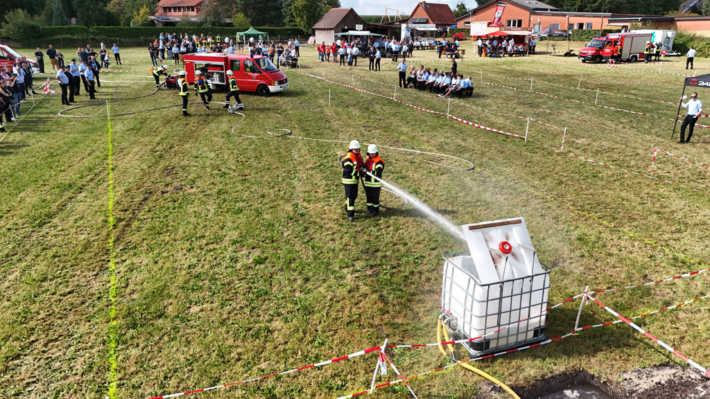 Auf insgesamt zwei Wettbewerbsbahnen wurden die Löschangriffe durchgeführt. Das Szenario war einen Mülltonnenbrand ohne weitere Ausbreitungsgefahr zu löschen. Die Wasserentnahme sollte aus einem Unterflurhydranten erfolgen und ein „Schlauchplatzer“ als weitere Aufgabe gemeistert werden. Nach der Abgabemenge von insgesamt 200 Liter Wasser mit dem ersten C-Strahlrohr in einem IBC-Behälter war die Aufgabe erfüllt. Kein Fehler wurde dabei von den kritischen Augen der Schiedsrichter übersehen.
