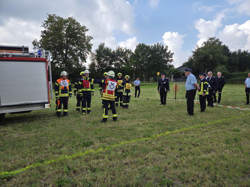 Es galt für die teilnehmenden Mannschaften sich an insgesamt drei Stationen zu messen und dabei möglichst wenig Fehlerpunkte zu sammeln, korrekte Befehle zu geben und eine vorgegebene Gesamtzeit für den Durchlauf nicht zu überschreiten. Bereits um 10:38 Uhr ging das erste Wettbewerbsteam an den Start. Die Positionen für Angriffs-, Wasser- und Schlauchtrupp wurden dieses Jahr nicht ausgelost und konnten im Vorwege selbst durch die Mannschaften bestimmt werden.